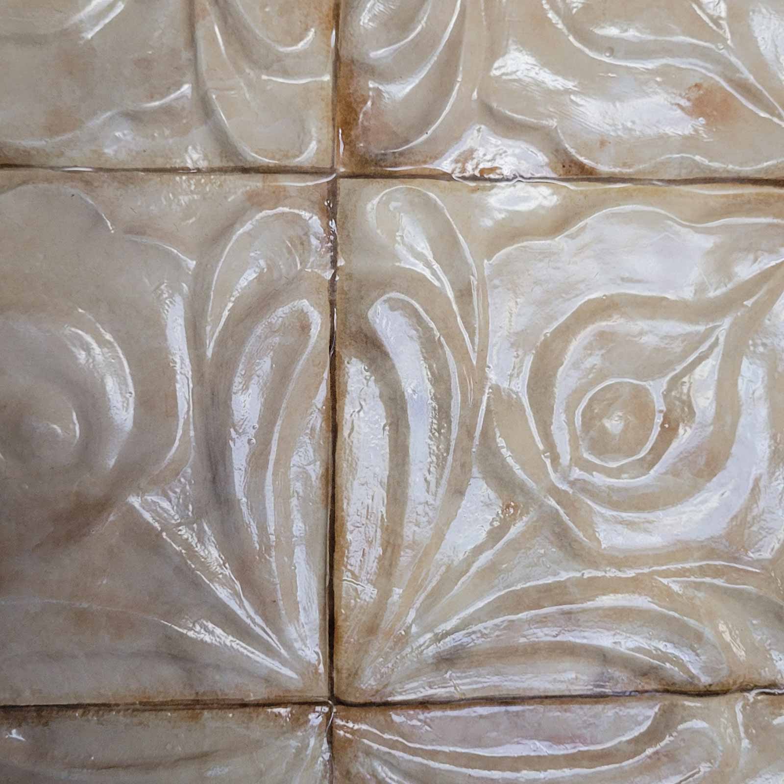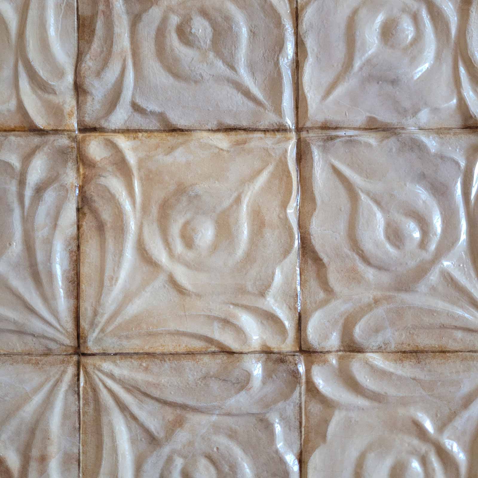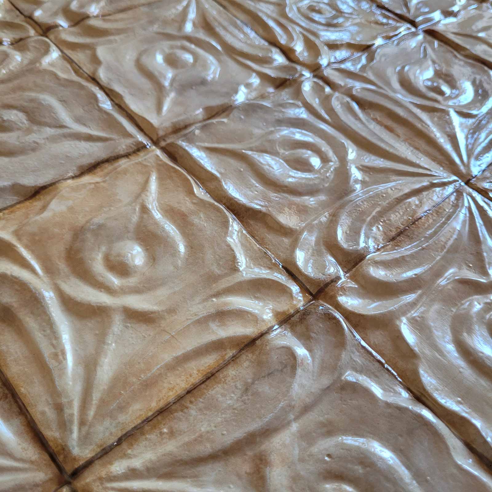 Ligeramente envejecidas. Superficie irregular, con grietas y pequeñas roturas en algunas baldosas, recreando una superficie antigua.
