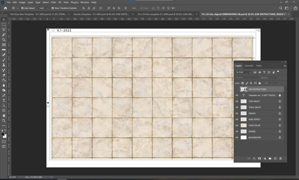Descarga la plantilla de Photoshop y empieza a editar tu diseño utilizando las diferentes capas de color, base, morteros, efectos de envejecimiento, etc. Ponte en contacto con nosotros si deseas que te enviemos la plantilla.