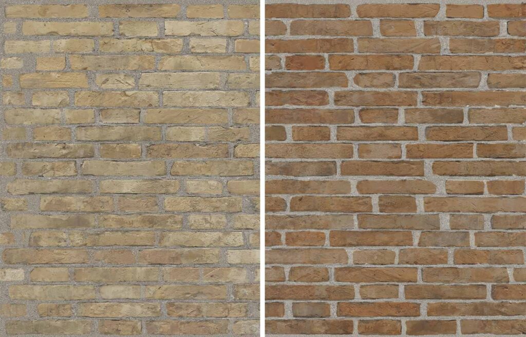 Uneven surface, weathered and chipped giving the brick a time-worn appearance.
