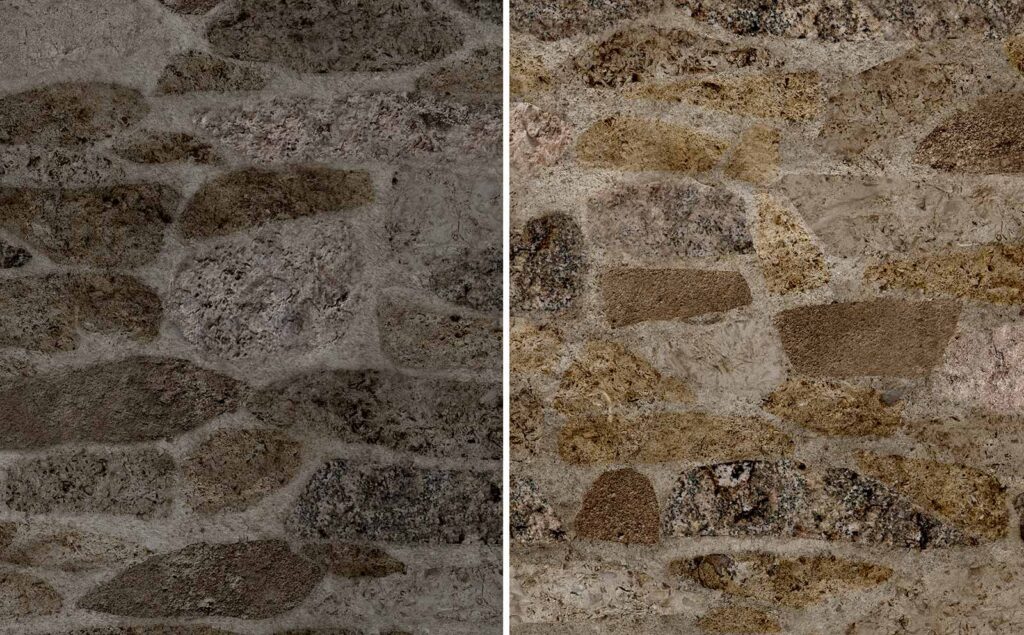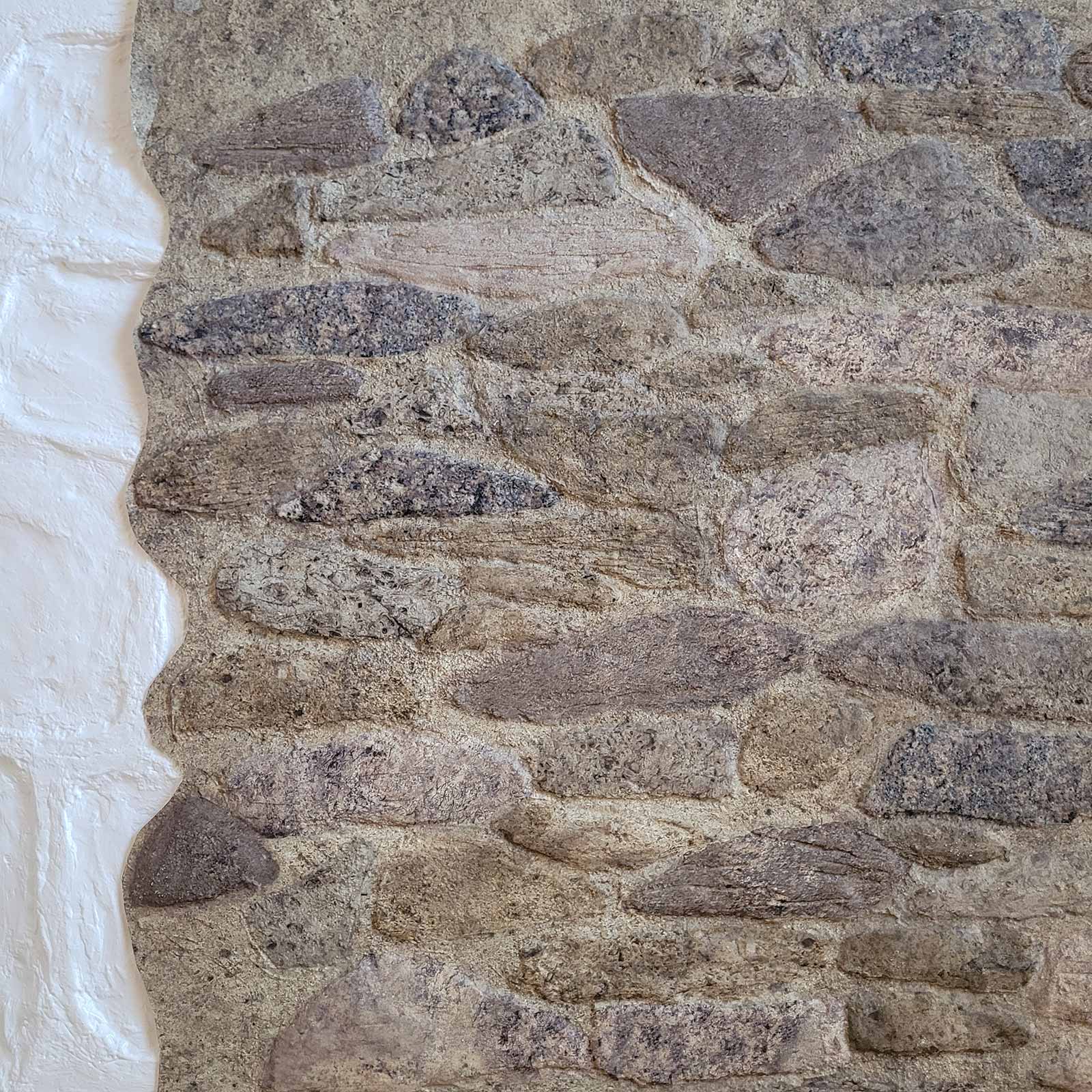 Superficie de piedra envejecida, con relieve y distribución irregular para proporcionar al muro un aspecto realista.